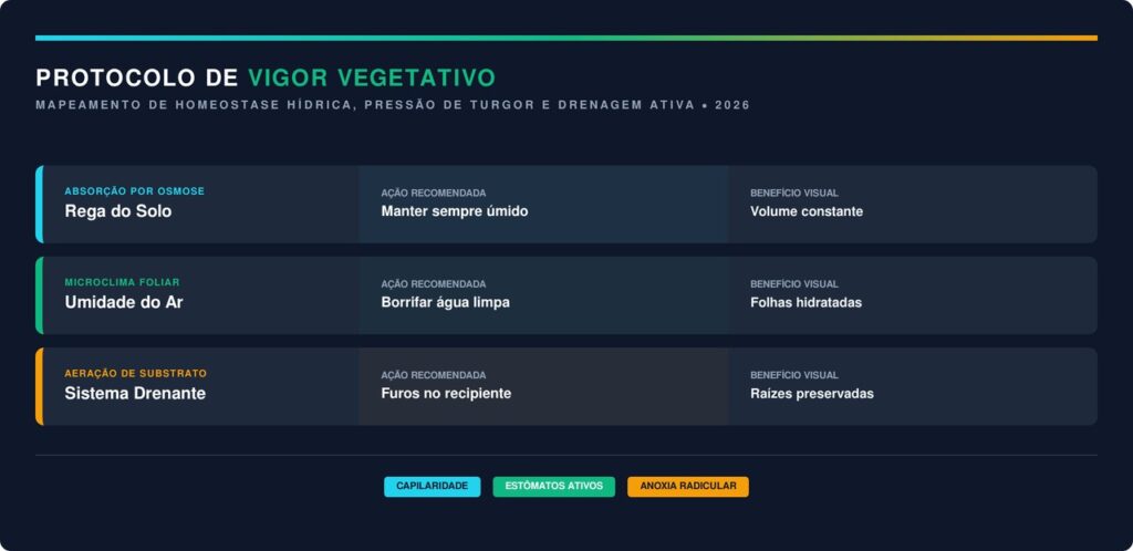 Manter a umidade constante ao redor do vaso é o segredo técnico para evitar que as bordas das folhas sequem de forma precoce. A evaporação controlada da água próxima à planta garante que os poros vegetais permaneçam abertos e saudáveis para o crescimento. Esta técnica é fundamental para garantir a vitalidade de espécies tropicais cultivadas em vasos ou canteiros.
