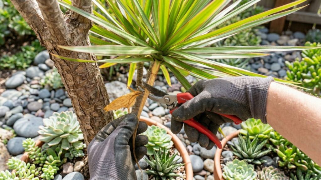 A manutenção visual envolve apenas a remoção ocasional das folhas inferiores que secam naturalmente com o passar do tempo. Esse processo de limpeza ajuda a destacar o tronco escultural e mantém a aparência organizada do jardim de pedras.