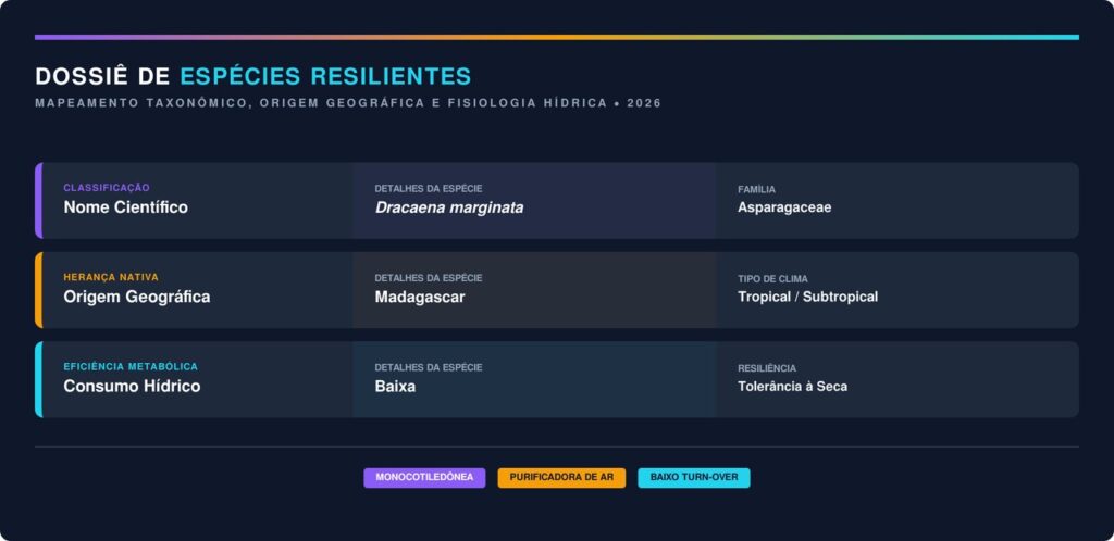 A Dracena de Madagascar é uma espécie arbustiva amplamente valorizada pela sua silhueta elegante e extrema resistência em ambientes áridos. Ela se adapta perfeitamente a solos rasos e pedregosos, sendo a escolha ideal para o paisagismo de baixa manutenção.