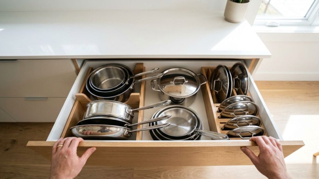A solução para a falta de espaço de armazenamento está no uso inteligente de gavetões profundos e divisórias organizadoras na parte inferior da cozinha. Pendurar panelas e acessórios em barras metálicas instaladas na parede também é uma forma funcional de manter tudo ao alcance.
