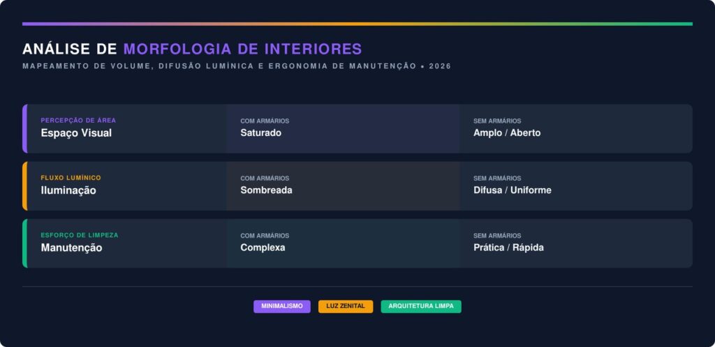 Muitos projetos atuais em cidades como São Paulo e Curitiba já adotam essa estética para aumentar a sensação de amplitude em apartamentos compactos. A ausência de sombras projetadas pelos armários também melhora a iluminação natural durante o dia.