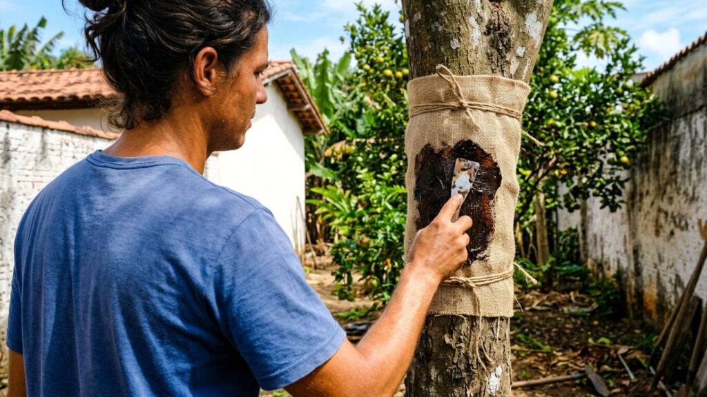 Técnica no tronco impede insetos de subir e protege frutos maduros com método prático e de baixo custo – Créditos: Imagem Ilustrativa