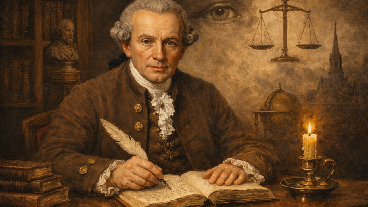 Immanuel Kant foi um filósofo alemão do século XVIII, considerado um dos principais nomes da filosofia ocidental. Autor de obras fundamentais como “Crítica da Razão Pura”, ele estruturou o chamado criticismo, que investiga os limites e as possibilidades do conhecimento humano.