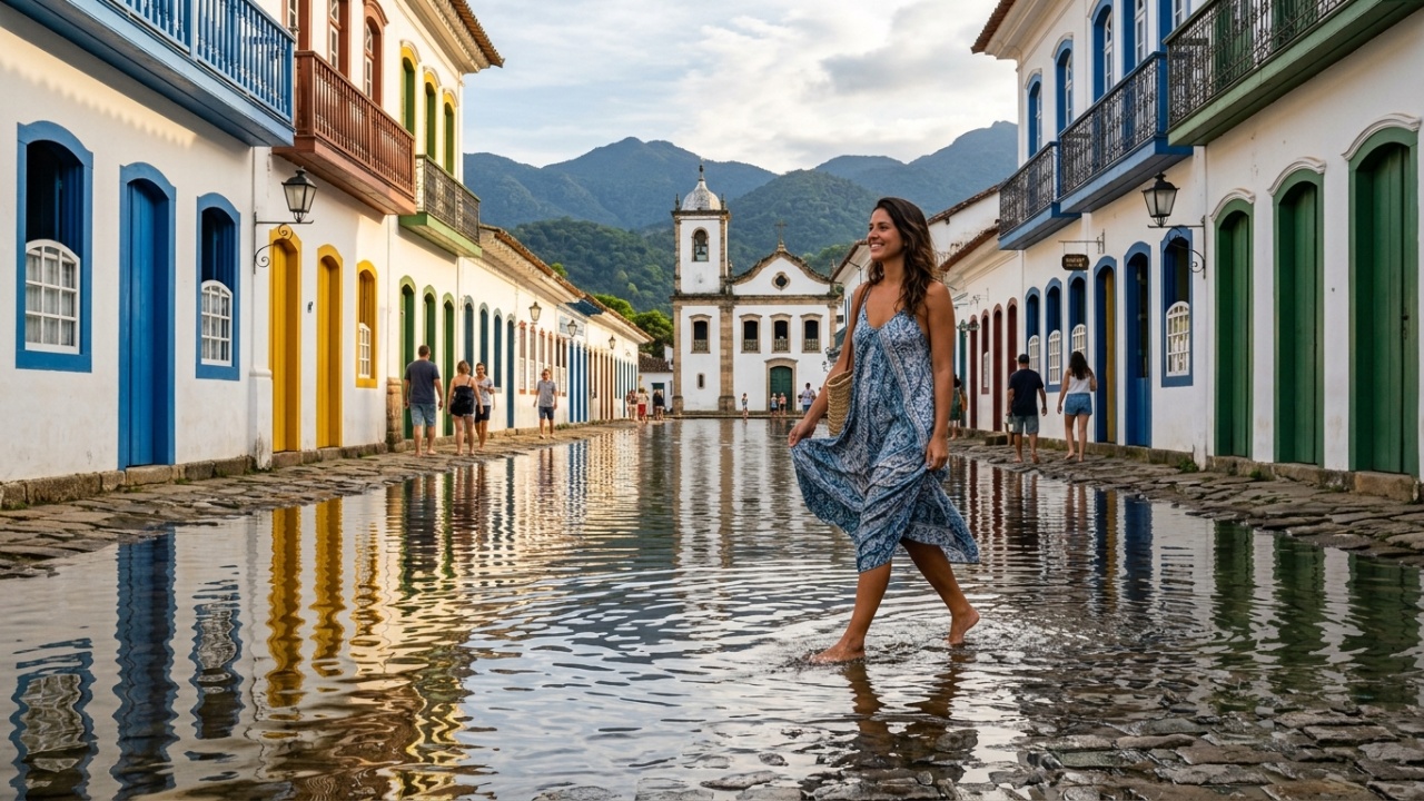 A pedra pé de moleque brilha molhada, a maré sobe devagar e o reflexo dos casarões coloniais pinta a água de azul. Fundada em 1667, Paraty guarda um segredo de engenharia do século XVIII: o mar entra no centro histórico de propósito para lavar as ruas, fenômeno único no Brasil que rendeu à cidade o apelido de Veneza Brasileira.