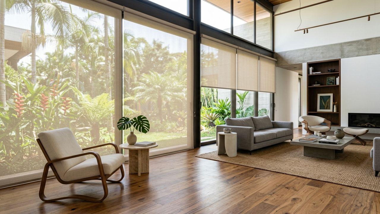 - Telas solares que filtram o calor sem escurecer o ambiente interno.