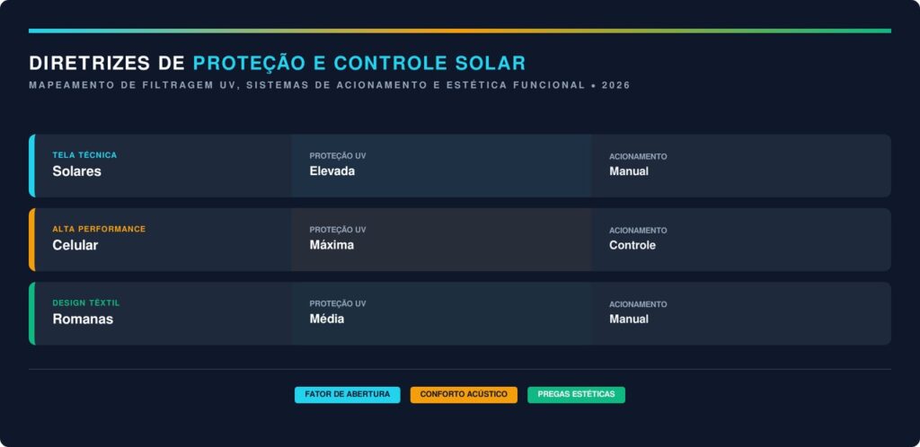 As opções contemporâneas utilizam tramas inteligentes que permitem a visão externa enquanto bloqueiam a visibilidade de fora para dentro do lar. O uso de fibras naturais e compostos de PVC garante durabilidade e resistência contra a radiação solar intensa.