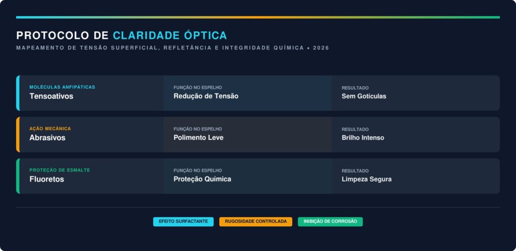 Os componentes abrasivos leves e os tensoativos presentes na fórmula reduzem a tensão superficial da água sobre o vidro. Isso impede que as gotas se unam, formando uma película invisível que mantém a transparência total no interior da residência de forma prática.