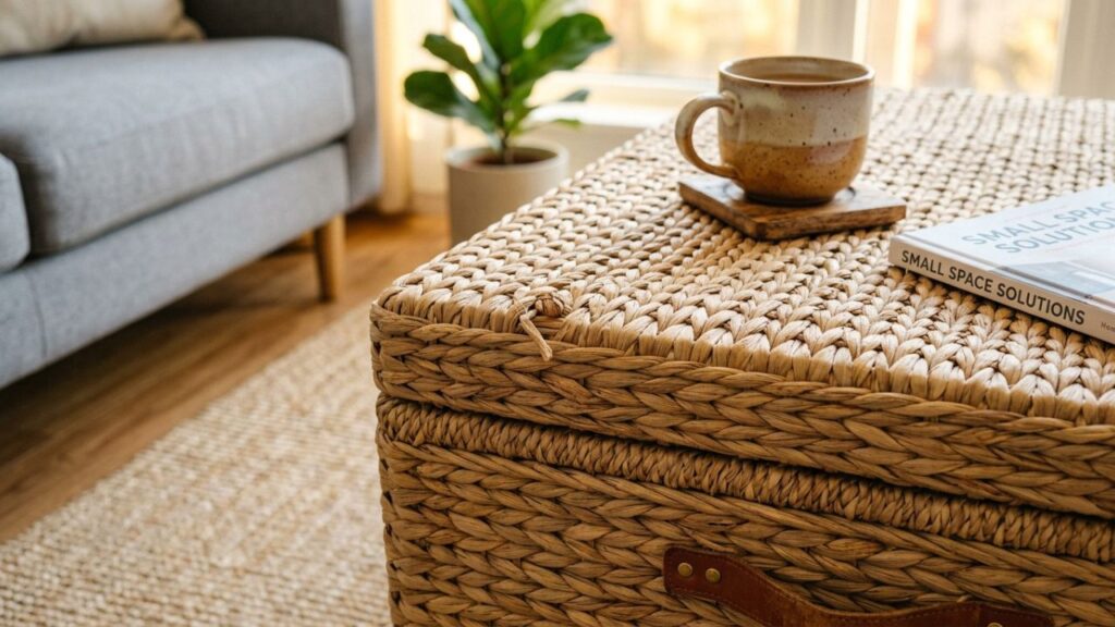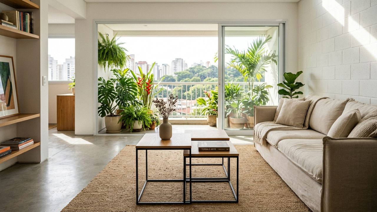 A substituição das mesas de centro de vidro por modelos versáteis reflete a busca por maior fluidez em ambientes compactos. Essa mudança prioriza a segurança e a multifuncionalidade para otimizar a circulação interna.