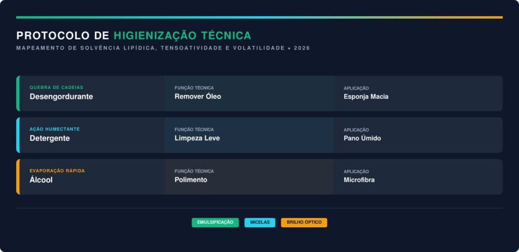 A escolha dos agentes químicos deve considerar a sensibilidade do material e a capacidade de quebra das moléculas de gordura carbonizada. É necessário utilizar substâncias que não causem riscos ou desbotamento no painel de controle eletrônico do aparelho metálico.