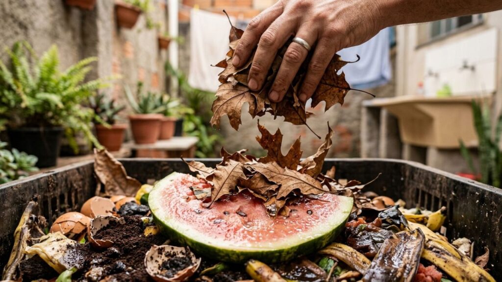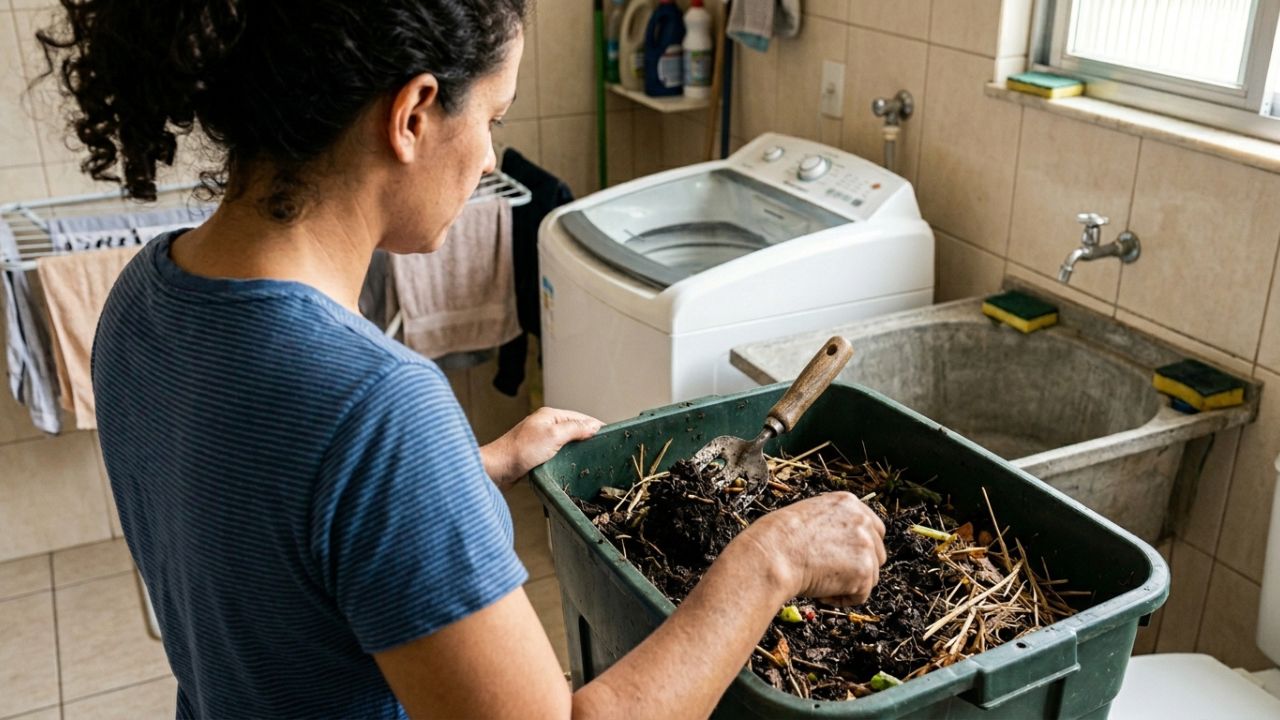 Pressionar levemente a cobertura ajuda a compactar os materiais e evita a entrada de moscas e outros invasores. Esse cuidado diário mantém o processo de decomposição limpo e eficiente para o uso em jardins domésticos do Brasil.