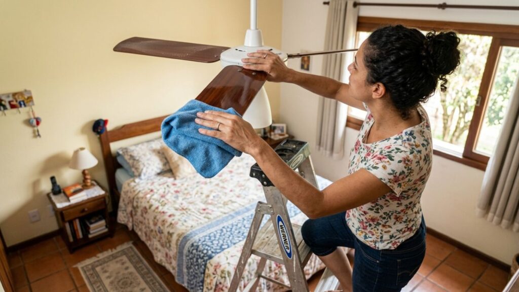 Uma das formas mais inteligentes de limpar as pás sem espalhar resíduos pelos móveis é utilizar uma fronha de travesseiro velha. Essa técnica física retém toda a fuligem dentro do tecido, evitando que o pó caia sobre a cama ou o sofá durante o processo.