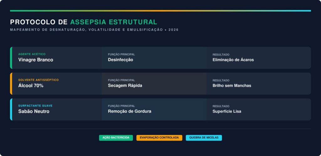 Após a remoção do pó grosso, é necessário higienizar a superfície com agentes que eliminem microrganismos e devolvam o brilho ao material. O uso de misturas caseiras ácidas ajuda a desinfetar o metal ou a madeira sem causar danos ao acabamento estético do ventilador.