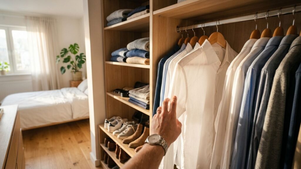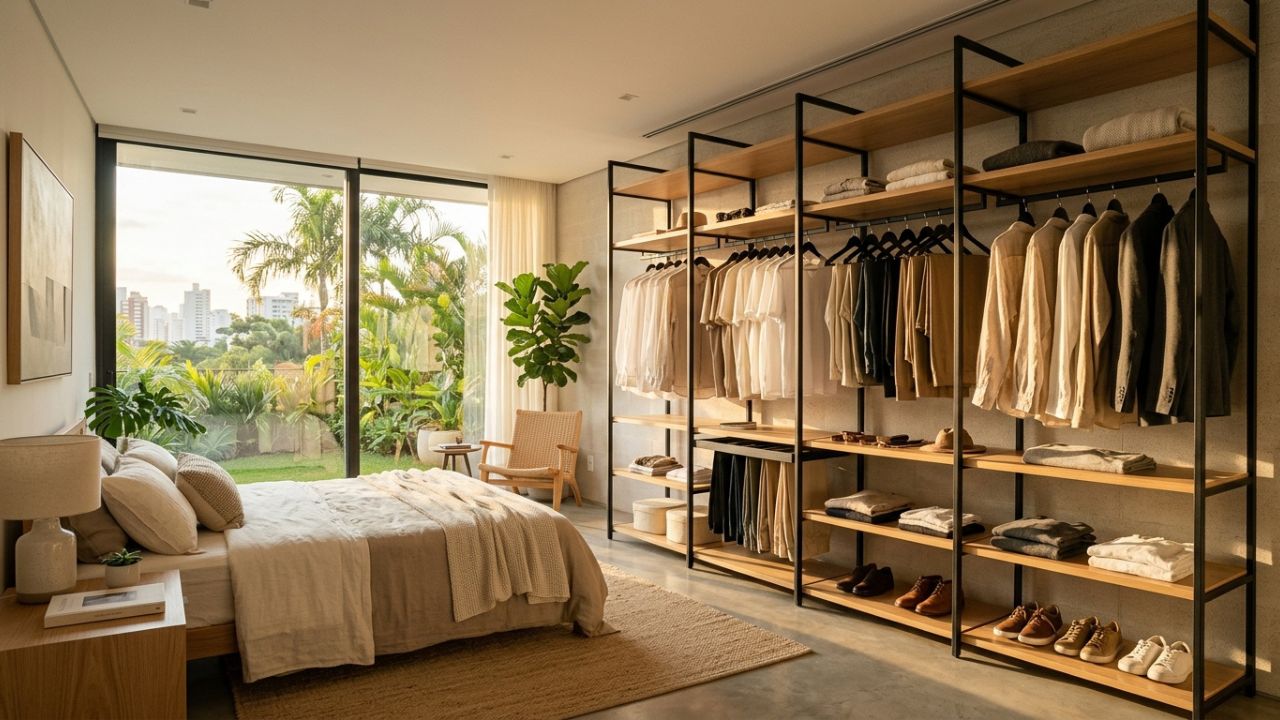 Essa abordagem valoriza a organização pessoal como parte integrante da decoração, transformando o estoque de roupas em um elemento visual. A simplicidade nas formas reflete o desejo por ambientes mais funcionais e fáceis de limpar no dia a dia.