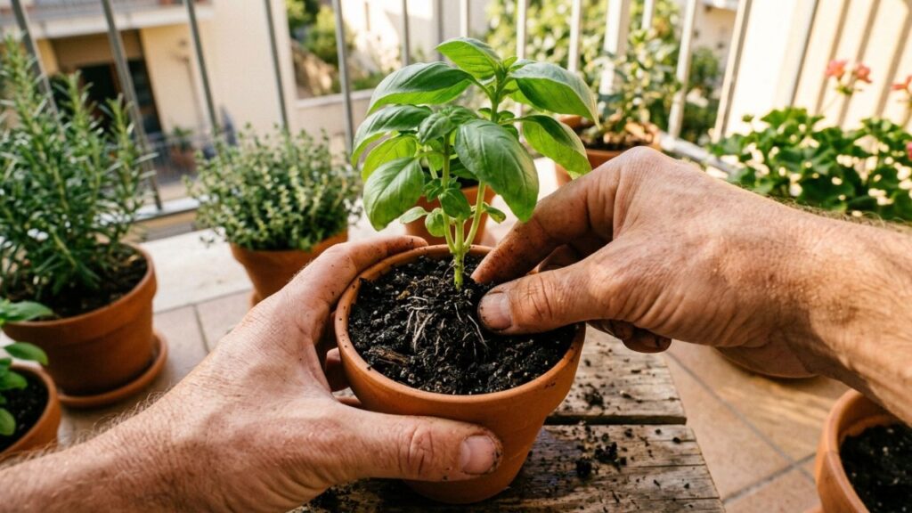 Ao plantar, é importante manter a terra bem úmida nos primeiros dias para que a transição seja suave. O tempero precisa de solo rico em matéria orgânica para continuar se desenvolvendo com vigor.