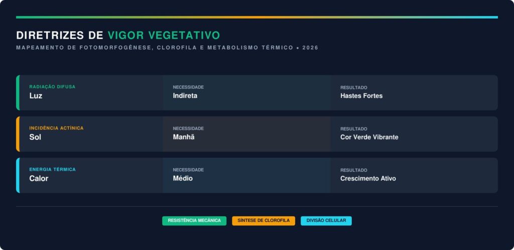 A claridade indireta é fundamental para evitar que a planta sofra estiolamento e perca o seu vigor estético natural. Hastes que crescem muito alongadas e finas são sinais claros de falta de luz solar diária.