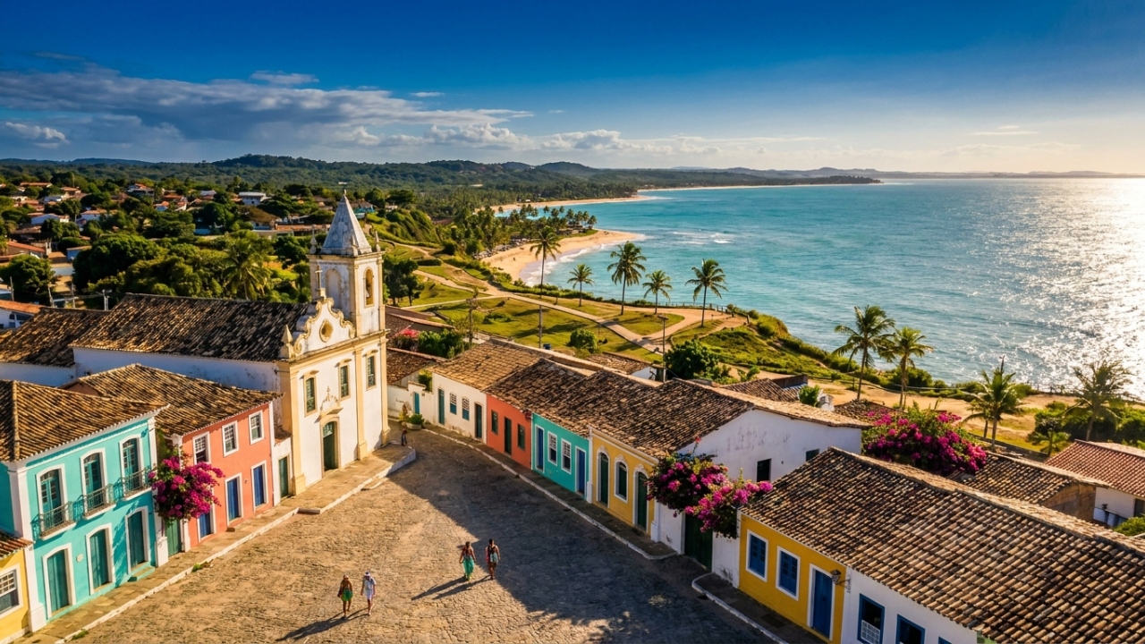 A 5 km do centro de Porto Seguro, no litoral sul da Bahia, Arraial d’Ajuda se equilibra sobre um platô de 40 metros com vista para o mar. O distrito combina o primeiro santuário mariano do Brasil, 11 km de praias de água morna e uma das noites mais animadas do litoral baiano.