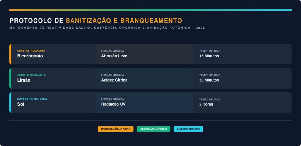 É fundamental seguir as proporções corretas para garantir que o plástico não fique ressecado ou com odores residuais após o procedimento de limpeza. Veja os dados técnicos sobre os principais agentes recomendados para esta finalidade: