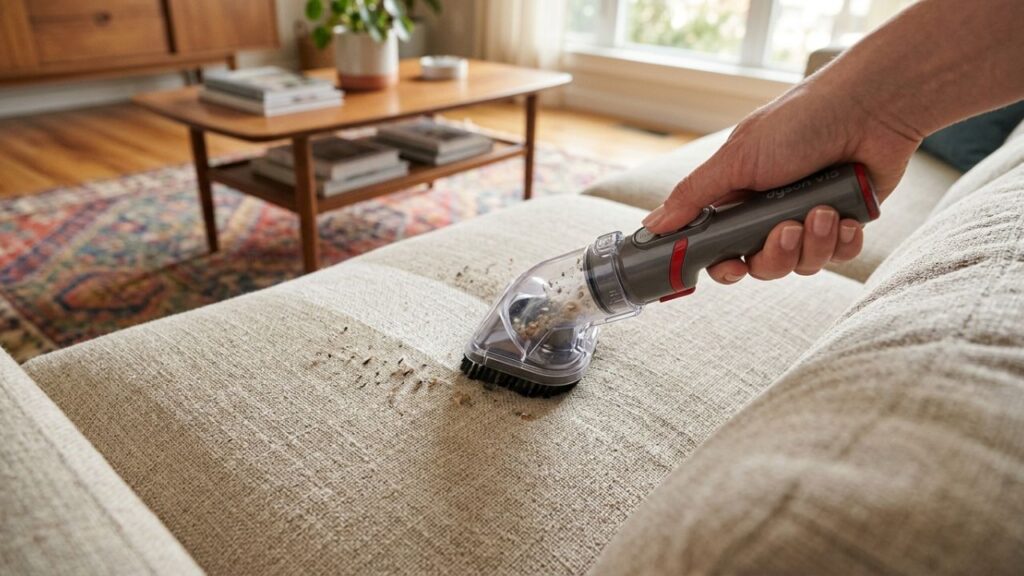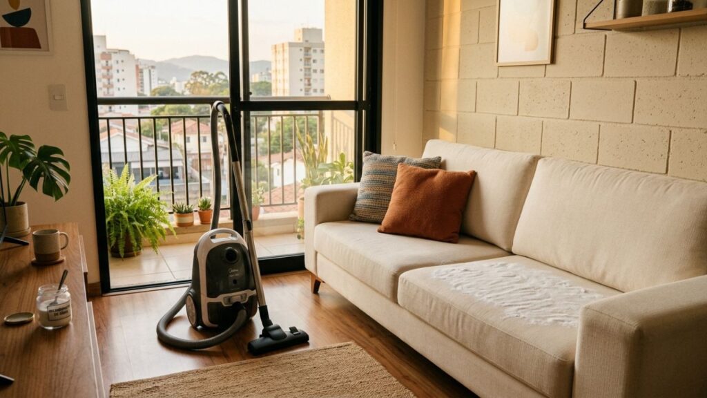 Aprenda a importância de aspirar as frestas antes de higienizar, evitando que a poeira sólida se transforme em lama e cause abrasão nas fibras – Créditos: Imagem Ilustrativa