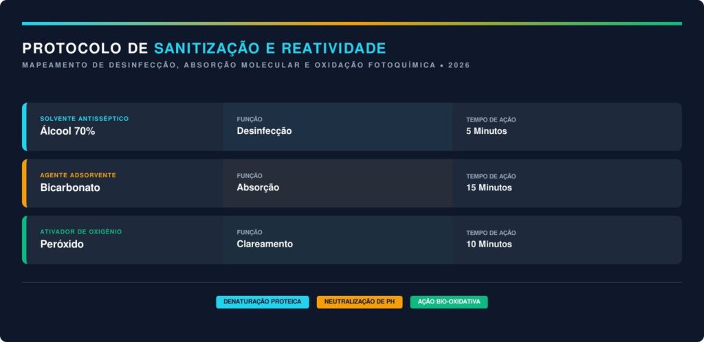 A escolha dos reagentes químicos deve considerar o potencial de hidrogênio da fibra para não causar manchas permanentes ou desbotamento do pigmento original do revestimento. Substâncias como o álcool isopropílico e o bicarbonato de sódio são amplamente utilizadas por especialistas em higienização técnica de estofados residenciais.