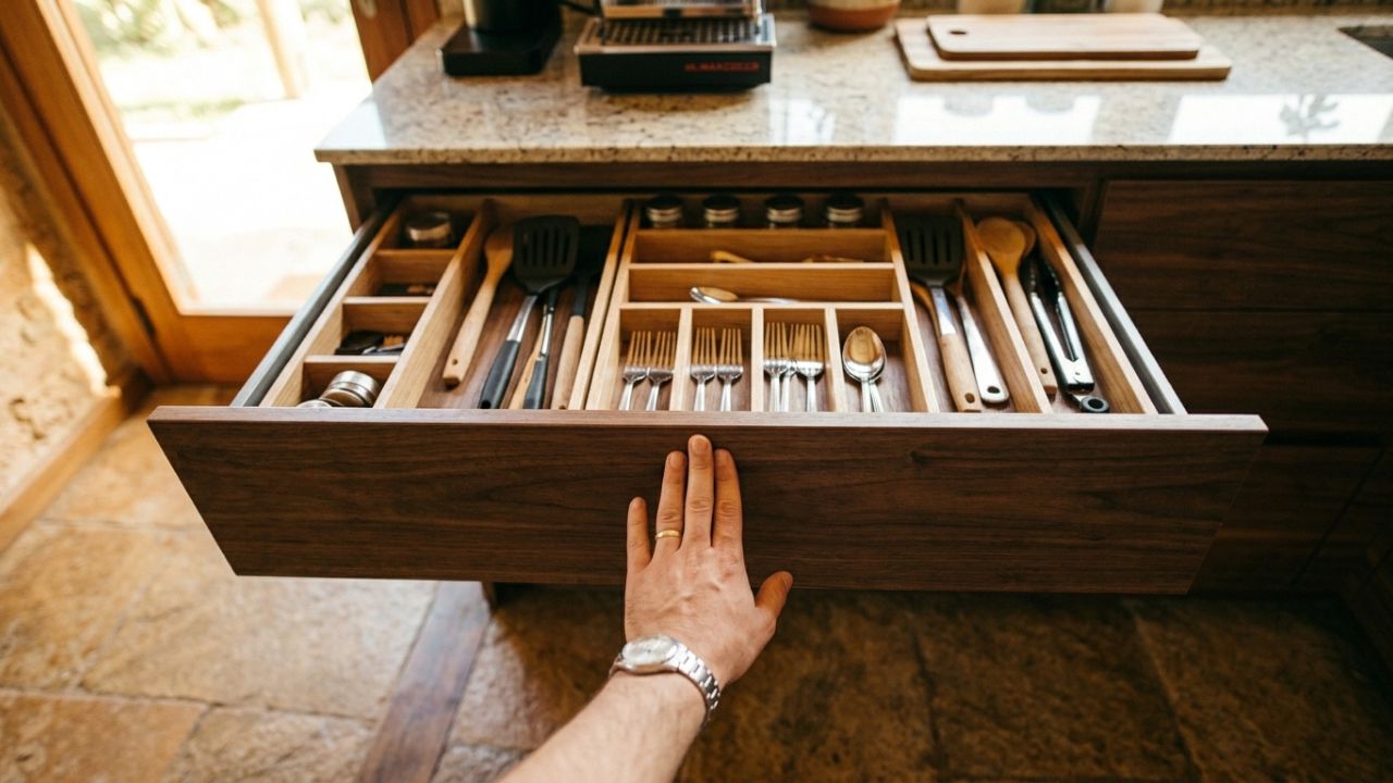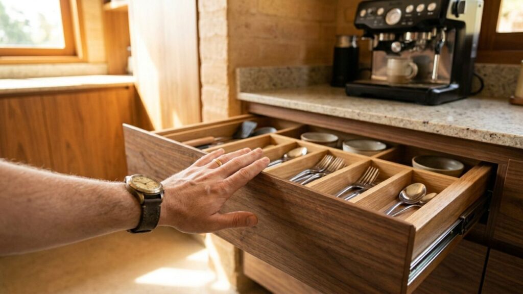 Laminados de alta pressão oferecem a resistência mecânica necessária para suportar a pressão constante nos pontos de abertura por toque. Escolher materiais certificados pela ABNT garante que a marcenaria suporte o calor e a umidade comuns em cozinhas.