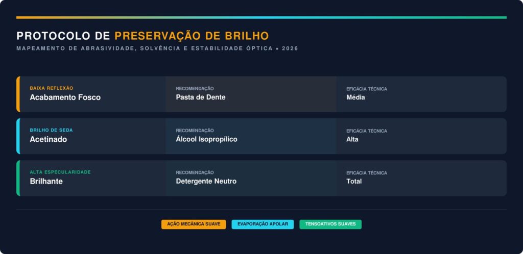 A utilização de cremes dentais brancos e não abrasivos funciona como um polidor suave que remove a pigmentação superficial sem riscar o gesso. Esta técnica é amplamente difundida em residências no Brasil devido à sua acessibilidade e baixo custo operacional doméstico.