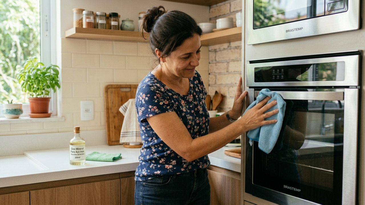 A aplicação de uma fina camada de óleo mineral sobre superfícies de aço inoxidável ajuda a mascarar manchas e evita a aderência de marcas de dedos. Esse método simples devolve o brilho original aos equipamentos e facilita a rotina de manutenção doméstica.
