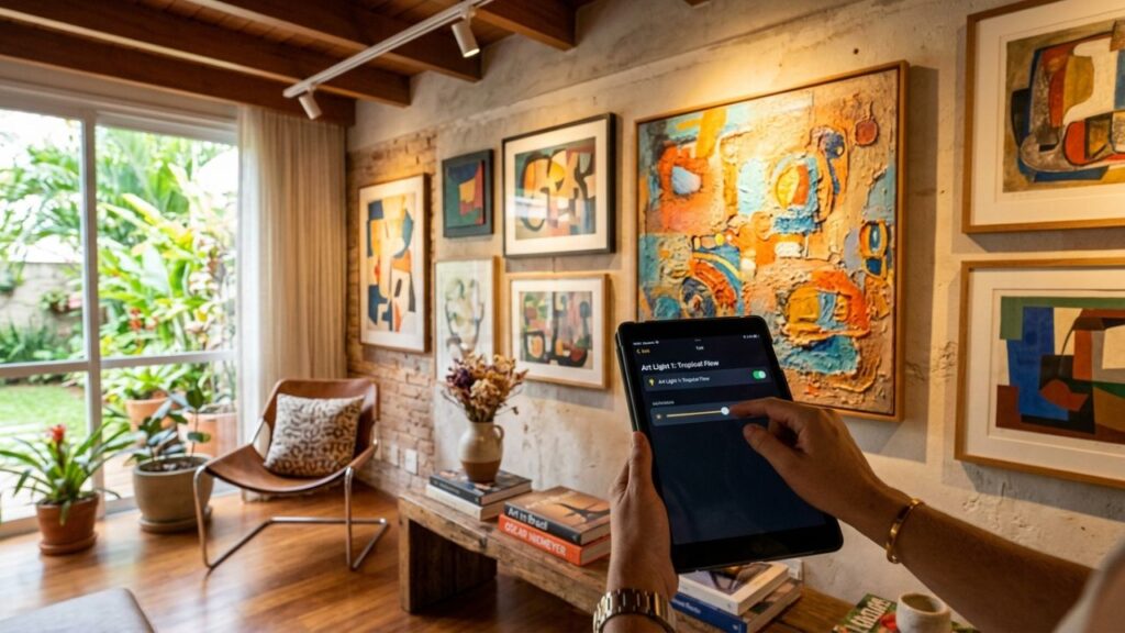 Luminárias com trilhos ou focos direcionados destacam as pinceladas e os contrastes presentes na arte contemporânea. O uso de lâmpadas com alto índice de reprodução de cor é fundamental para preservar a fidelidade das matizes escolhidas.