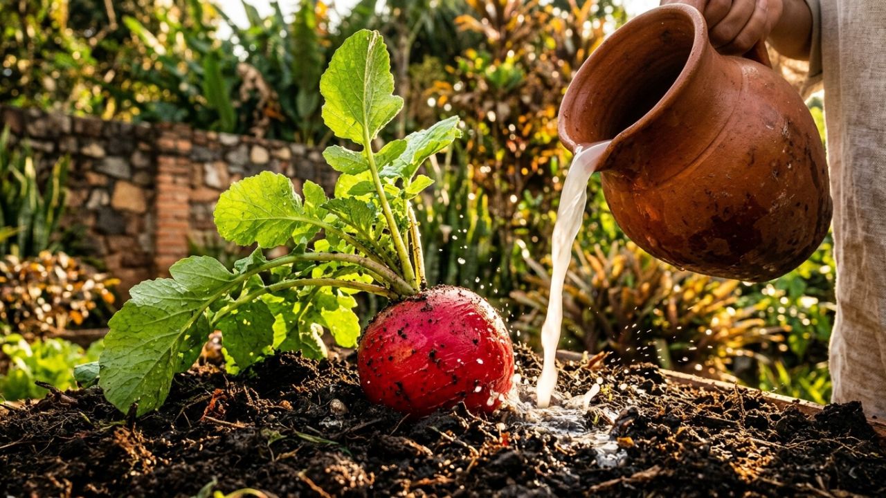 Os rabanetes germinam como fermento: ao molhá-los na terra, adicione meio copo de água de lavagem de arroz