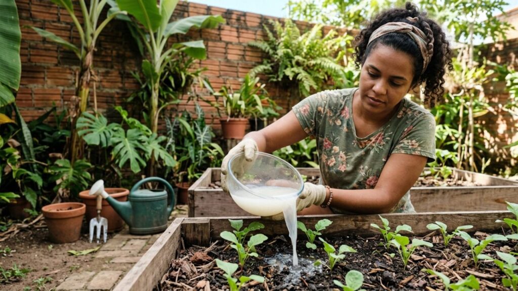 Aprenda a aplicar a solução da primeira lavagem diretamente na base das plantas a cada três dias, garantindo densidade nutricional sem fermentação – Créditos: Imagem Ilustrativa