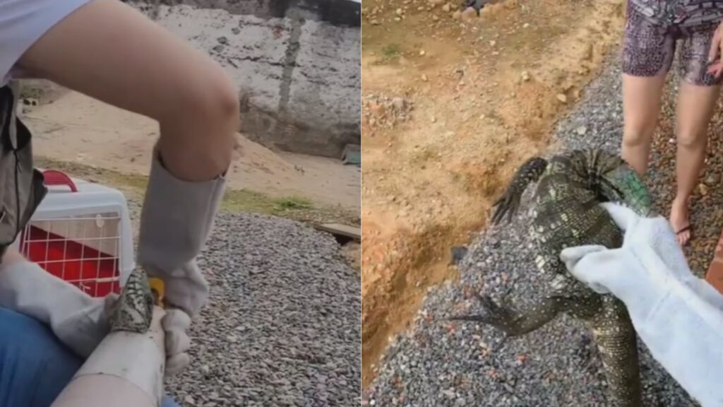 Segundo o relato do biólogo nas redes sociais, a cena misturava surpresa e preocupação: o lagarto, imóvel e claramente estressado, não conseguia se soltar e permanecia totalmente vulnerável. A pessoa que encontrou o animal agiu rápido e entrou em contato com o profissional, conhecido na região por atuar em ocorrências com animais silvestres.