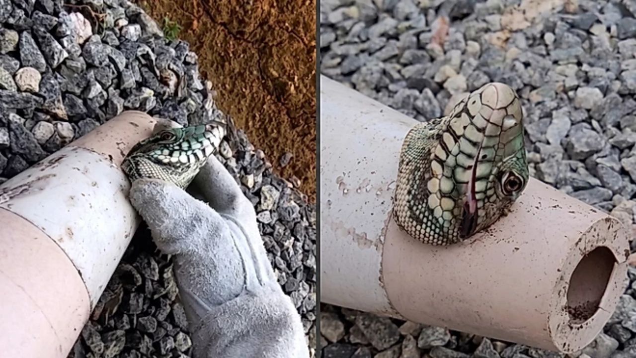 Ao chegar ao local, Duwe percebeu que o réptil não estava preso em um cano, como se imaginava, mas em um cone de sinalização quebrado. A abertura torta funcionou como armadilha: o lagarto entrou com facilidade, mas não conseguiu tirar a cabeça. Situações assim são mais comuns do que se pensa em áreas urbanas cheias de entulho e objetos danificados espalhados pelo chão.
