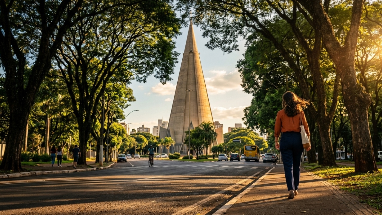 No noroeste do Paraná, Maringá recebe quem chega com avenidas largas, túneis de árvores e uma catedral cônica de 124 metros que rasga o horizonte. A cidade lidera o ranking nacional de saneamento e tem qualidade de vida acima de qualquer capital brasileira.