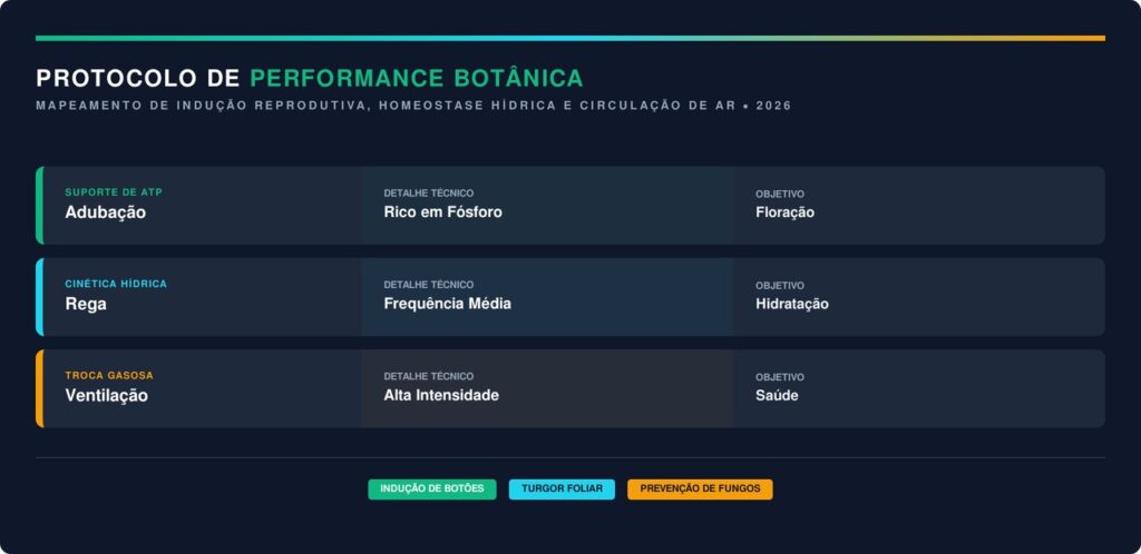A indução floral depende diretamente do equilíbrio entre a rega controlada e a exposição solar indireta durante os meses de desenvolvimento. O fornecimento constante de nutrientes específicos fortalece a haste para suportar o peso de centenas de flores.