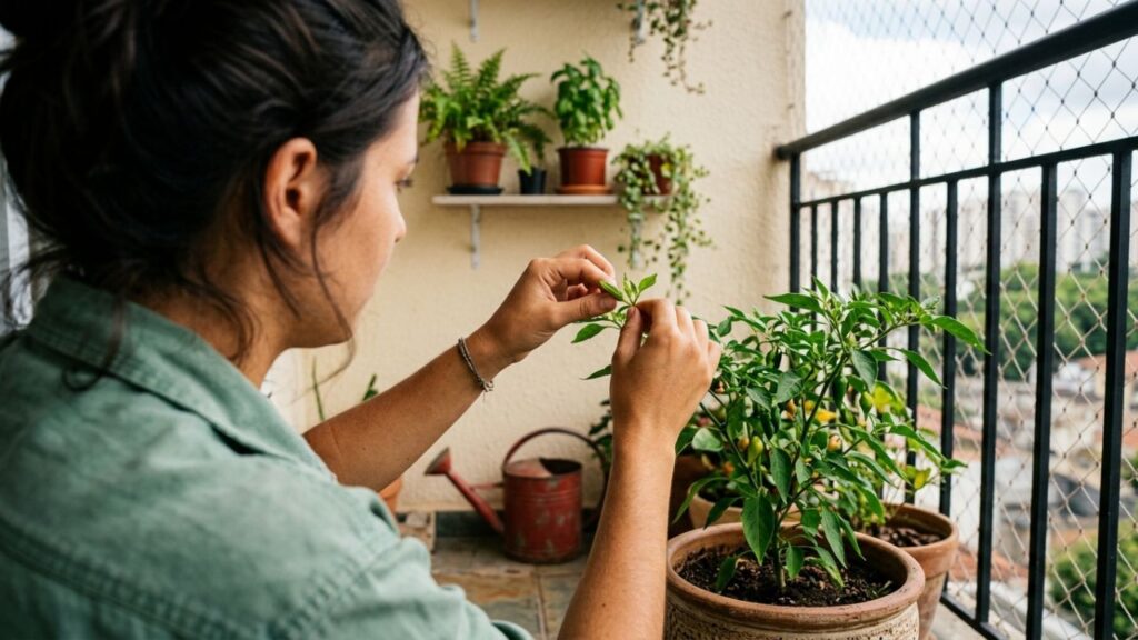 A técnica da poda de beliscão é essencial para transformar pimenteiras altas e magras em arbustos produtivos e cheios de ramificações laterais. Esse manejo simples estimula o crescimento e aumenta significativamente a carga de frutos na colheita.