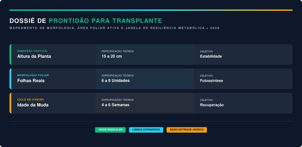 A intervenção técnica deve ocorrer apenas quando a muda apresenta um sistema radicular estabelecido e uma altura mínima segura para suportar o manejo. O monitoramento rigoroso das condições biológicas da espécie garante que a poda de topo não cause um estresse excessivo.