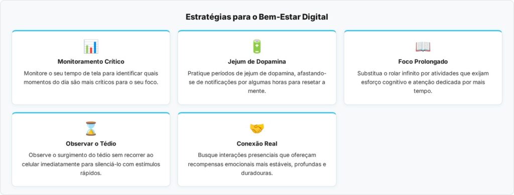 A psicologia alerta que, ao fugir do tédio através das telas, perdemos a capacidade de reflexão e criatividade, que são processos que dependem justamente de momentos de pausa e introspecção. Dica rápida: o hábito de “escanear” conteúdos sem absorver nada é um sinal de que sua mente está apenas tentando silenciar o desconforto da própria companhia, sem gerar qualquer valor real para o seu bem-estar emocional.