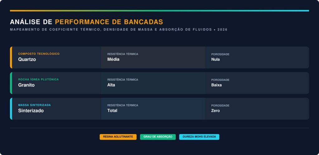 A escolha técnica do revestimento deve levar em conta o uso diário e a exposição constante a agentes corrosivos presentes nos alimentos e produtos químicos. Veja os dados comparativos sobre o desempenho térmico e a porosidade dos principais revestimentos modernos: