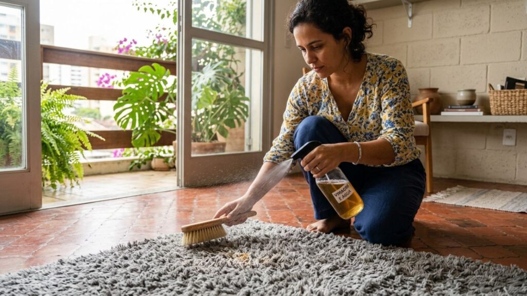 O vinagre branco atua como um amaciante natural que ajuda a selar as cutículas das fibras e remover resíduos de sabão que deixam o tapete rígido. A aplicação deve ser feita de forma pulverizada para garantir que o líquido alcance toda a extensão necessária.