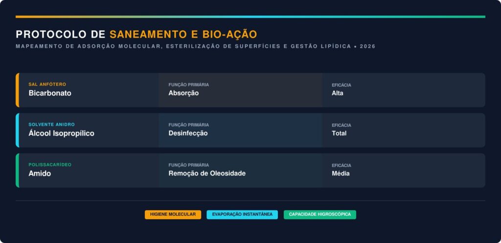 A escolha dos componentes químicos deve considerar o potencial de hidrogênio da fibra para evitar o desbotamento ou o ressecamento do material sintético. Solventes voláteis são indicados para dissolver gorduras sem saturar o estofado com excesso de água.