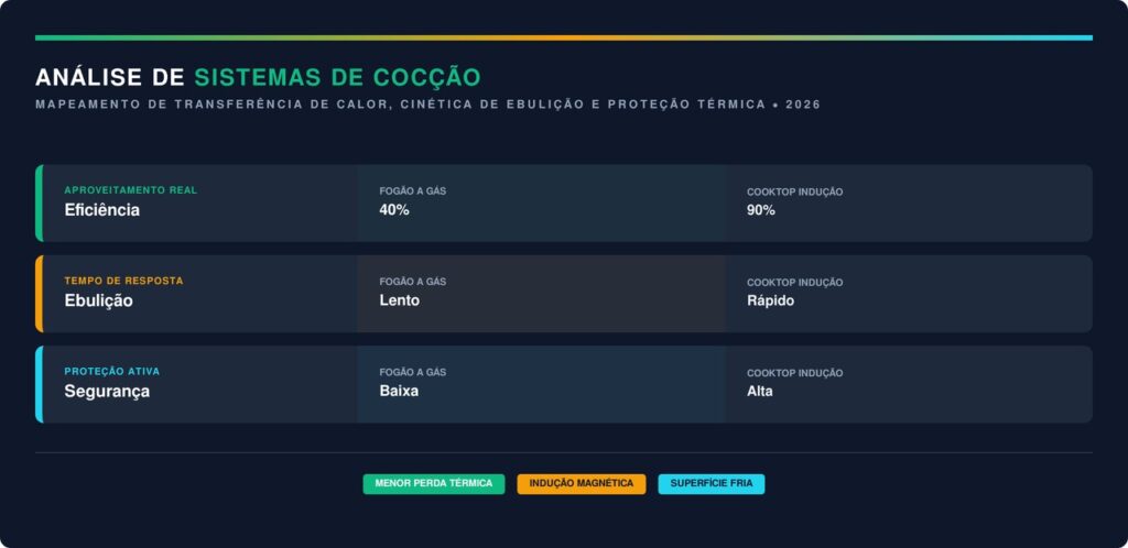 A eficiência do sistema de indução reside na geração de calor diretamente na base do utensílio, eliminando a dispersão de energia térmica para o ar ambiente. Esse processo físico garante um aquecimento muito mais rápido e um controle exato da temperatura durante todo o manuseio dos alimentos.