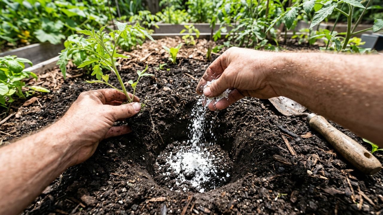 Adicionar uma colher de sopa do preparado no fundo da cova permite que as raízes acessem o mineral imediatamente. Essa proximidade física acelera o fortalecimento do caule principal logo nas primeiras semanas de desenvolvimento da muda de tomate.