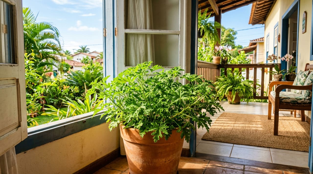 • Ao lado de janelas abertas: a brisa que entra pela janela carrega os óleos essenciais da citronela para dentro do ambiente, ampliando o efeito repelente para além do ponto onde a planta está