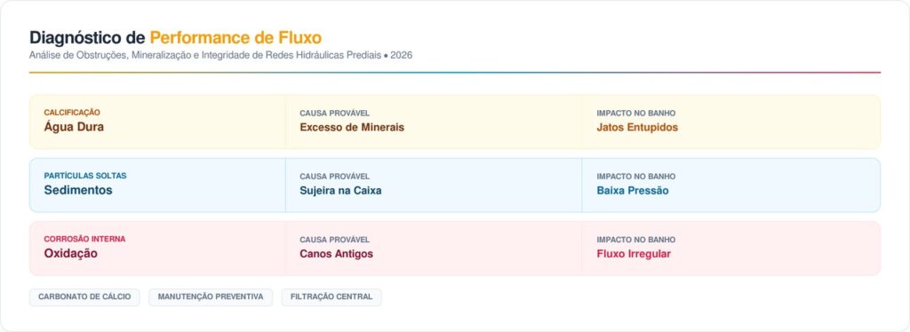 A água que chega às residências carrega minerais e sedimentos que se depositam nas partes internas dos metais sanitários. Com o tempo, o calor acelera a solidificação dessas partículas, bloqueando a passagem do fluxo hídrico constante.