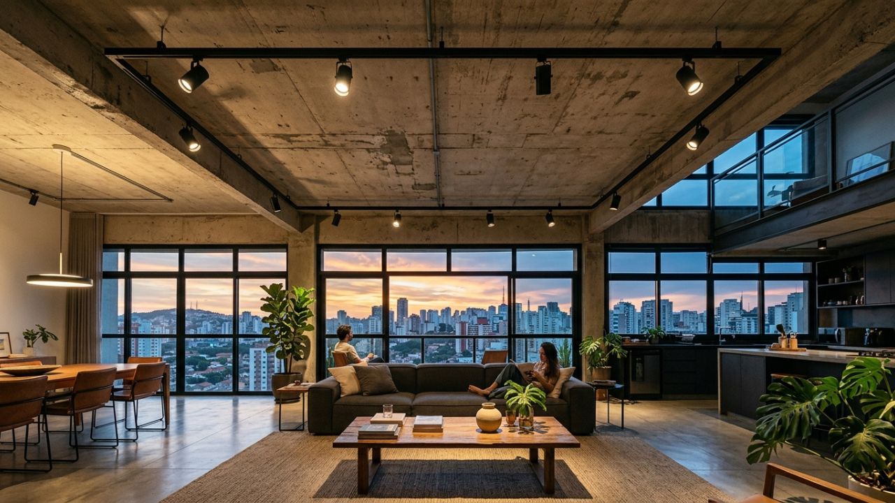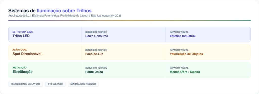 Planejar a distribuição dos trilhos exige atenção ao equilíbrio entre a luz geral do ambiente e os focos de destaque em quadros ou móveis. É possível combinar diferentes modelos de spots e pendentes em um mesmo barramento metálico para criar uma composição exclusiva.