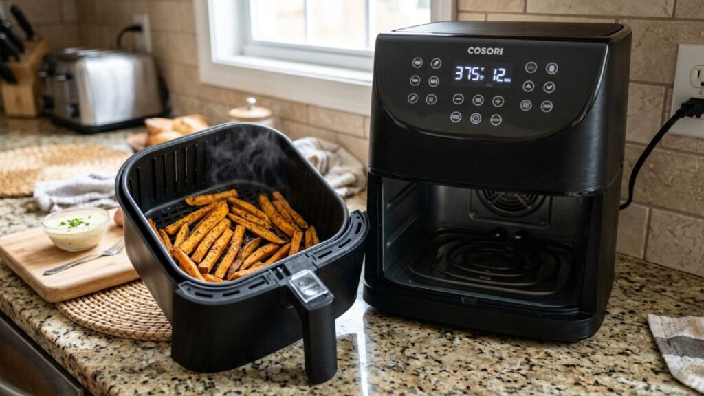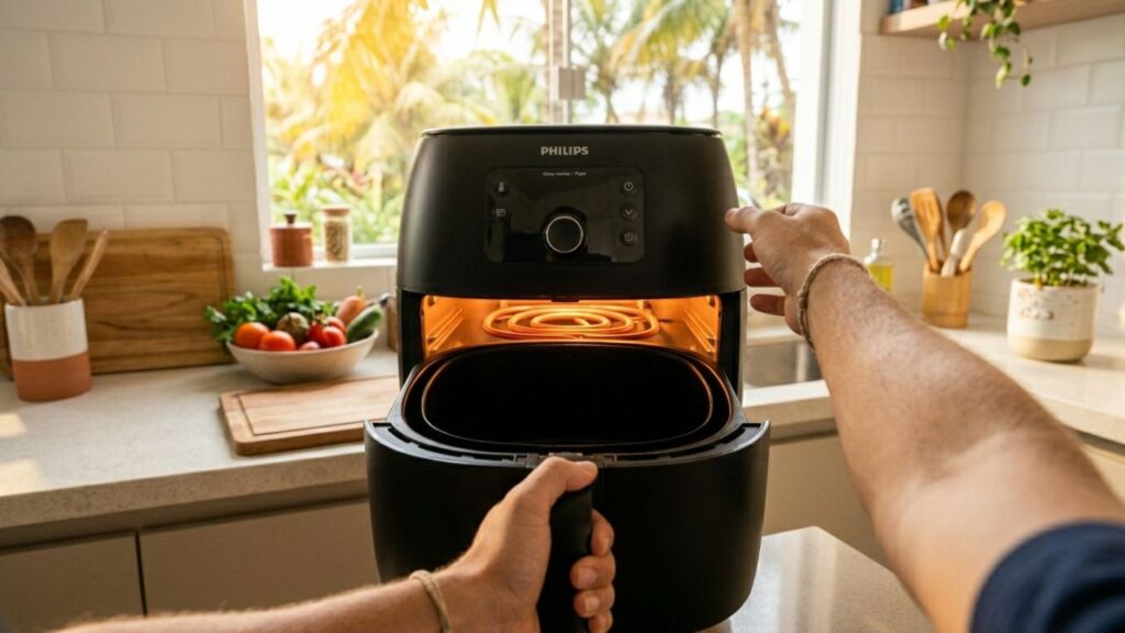 Limpar o cesto e a cuba após cada uso impede que os vapores de gordura velha subam para a resistência no próximo ciclo. Esse cuidado simples mantém a parte interna da Airfryer limpa por mais tempo e evita a formação de fumaça.