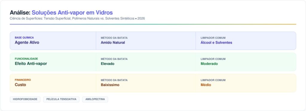 A eficácia contra o vapor ocorre devido à barreira hidrofóbica que o amido deposita sobre o vidro durante a esfregação manual vigorosa. Essa proteção é temporária, mas oferece uma solução de baixo custo para locais que não seguem os rígidos padrões de ventilação da ABNT.