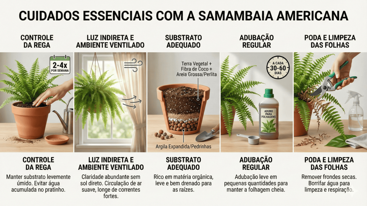 Para manter a samambaia americana sempre cheia e verdinha, alguns hábitos fazem toda a diferença na rotina de cuidados. Com atenção à água, luz, solo, adubação e limpeza, a planta responde rápido, brotando novas folhas e recuperando o brilho mesmo depois de períodos mais difíceis.