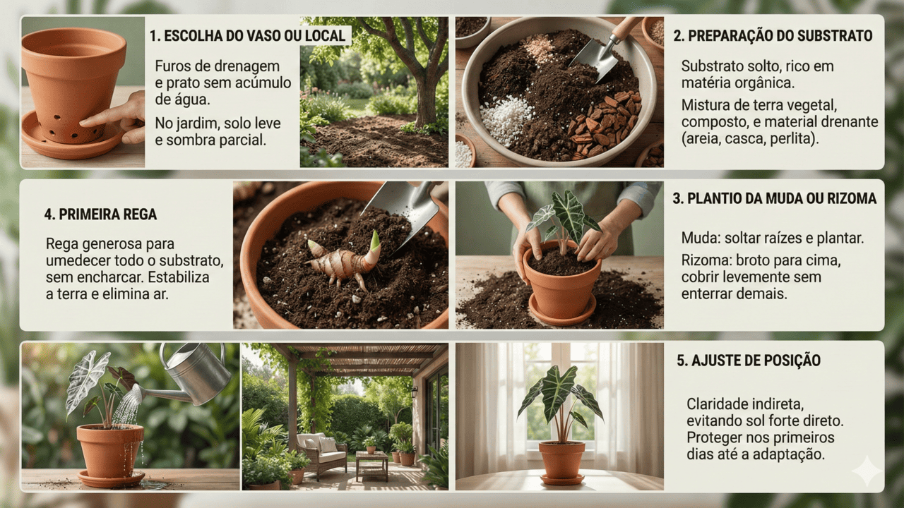 Na hora de decidir como plantar alocasia, pense primeiro se ela ficará em vaso ou direto no jardim, considerando o espaço e o estilo da sua casa. Em apartamentos, o cultivo em vasos é mais comum, porque permite controlar melhor luz, umidade e crescimento da raiz; já em áreas externas, em canteiros, as folhas podem atingir um porte mais imponente e criar um visual bem tropical.