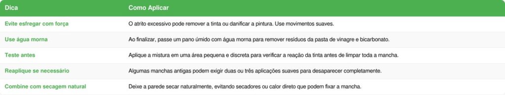 - Secagem: deixe a parede secar naturalmente e observe se a mancha desapareceu por completo.